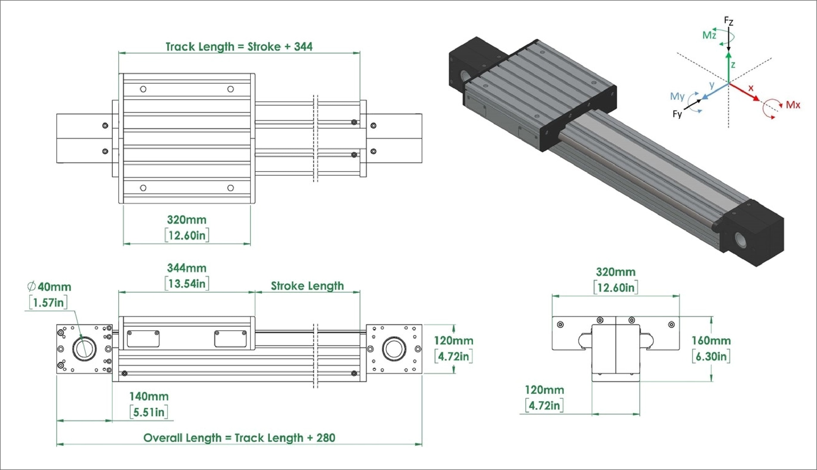 Model | Max Dynamic Load (Lb/N) | Max Static Load (Fz)(Lb/N) | Max Static Load (Fy)(Lb/N) | Static Moment Load (Mz-Yaw)(in-lb/Nm) | Static Moment Load (My-Pitch)(in-lb/Nm) | Static Moment Load (Mx-Roll)(in-lb/Nm) |