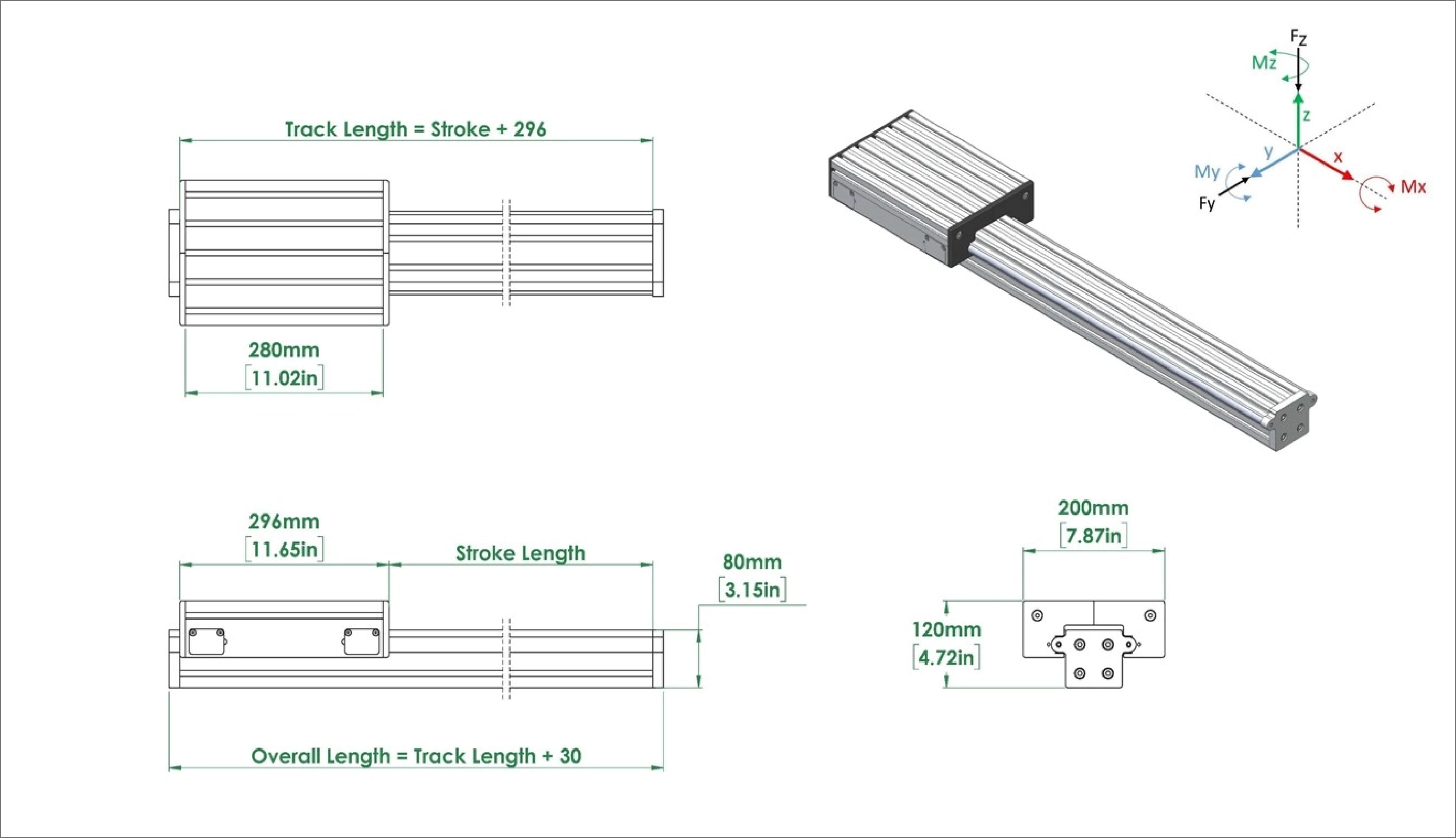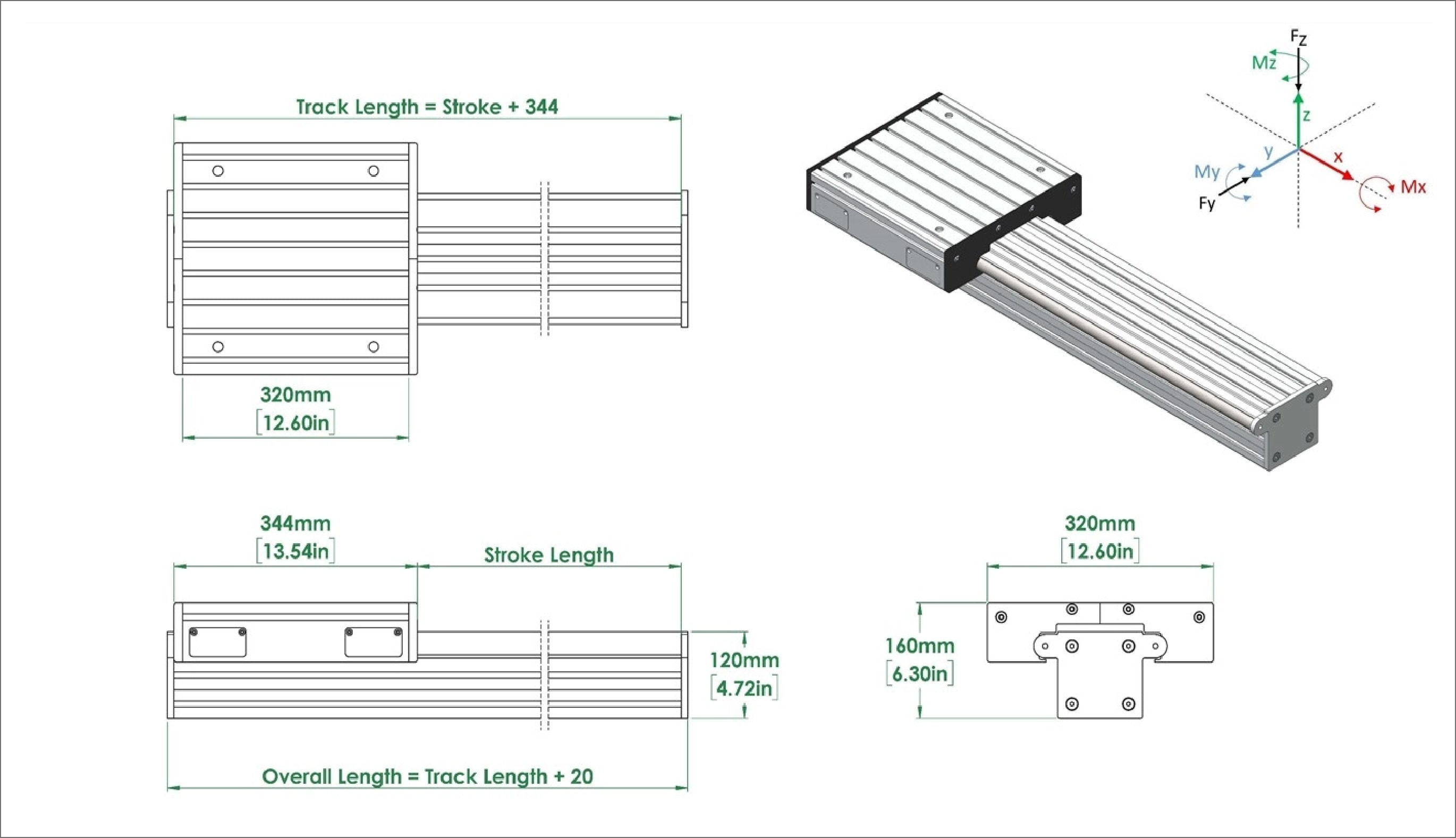 Model | Max Dynamic Load (Lb/N) | Max Static Load (Fz)(Lb/N) | Max Static Load (Fy)(Lb/N) | Static Moment Load (Mz-Yaw)(in-lb/Nm) | Static Moment Load (My-Pitch)(in-lb/Nm) | Static Moment Load (Mx-Roll)(in-lb/Nm) |