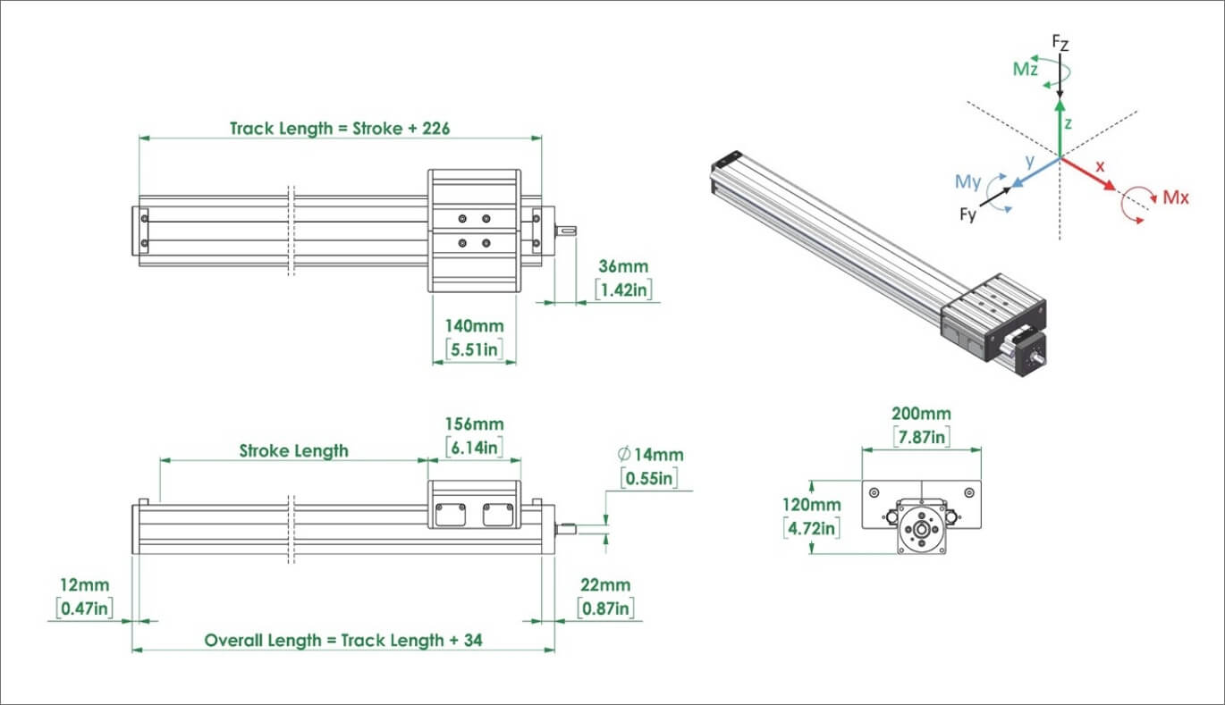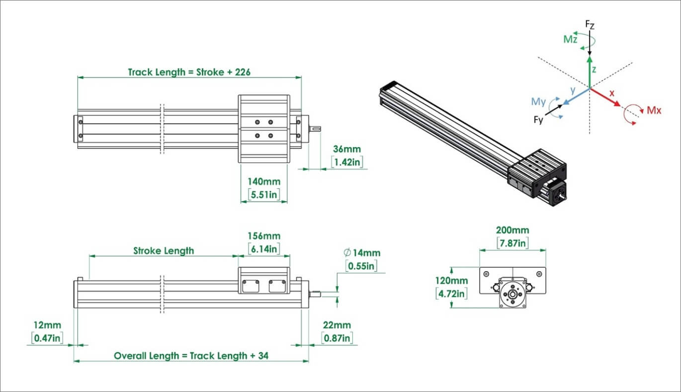 Model | Max Dynamic Load (Lb/N) | Max Static Load (Fz)(Lb/N) | Max Static Load (Fy)(Lb/N) | Static Moment Load (Mz-Yaw)(in-lb/Nm) | Static Moment Load (My-Pitch)(in-lb/Nm) | Static Moment Load (Mx-Roll)(in-lb/Nm) |