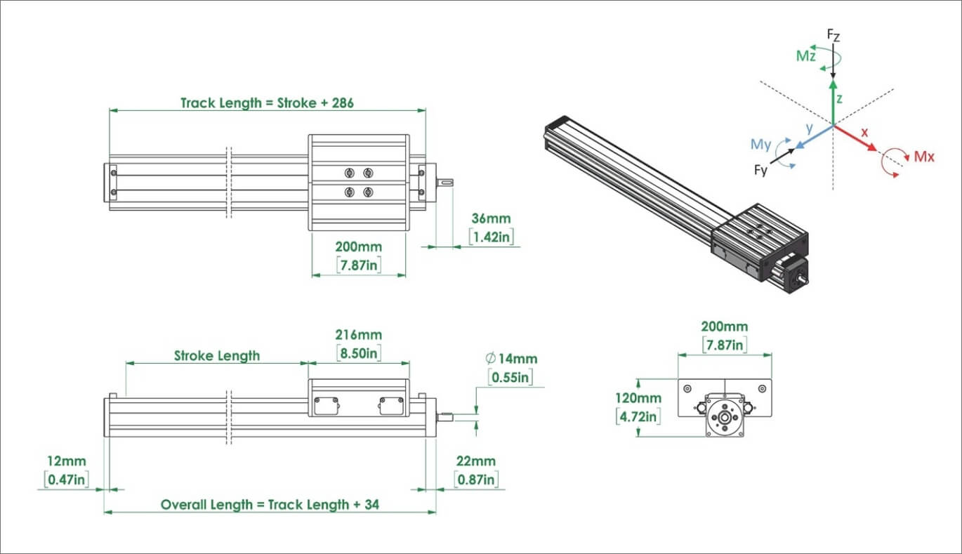 Model | Max Dynamic Load (Lb/N) | Max Static Load (Fz)(Lb/N) | Max Static Load (Fy)(Lb/N) | Static Moment Load (Mz-Yaw)(in-lb/Nm) | Static Moment Load (My-Pitch)(in-lb/Nm) | Static Moment Load (Mx-Roll)(in-lb/Nm) |