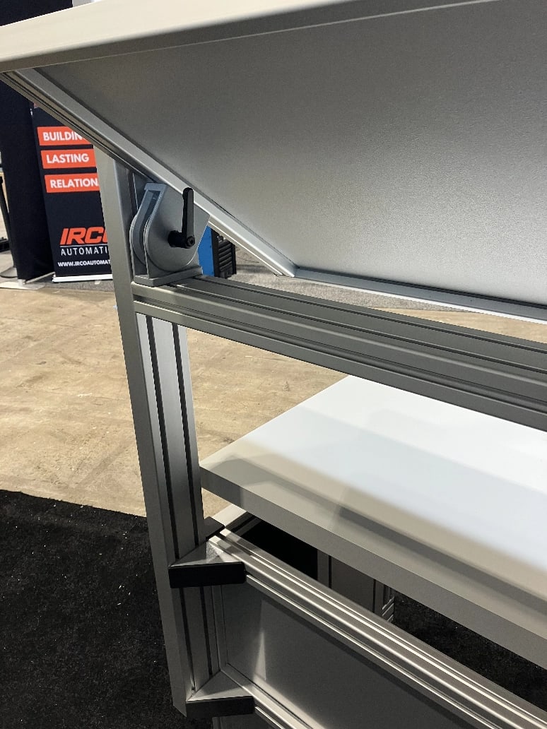 This work-cell bench shown to the left has been one of our most popular tradeshow feature exhibits and we have sold several to customers right on the spot! In addition to a very practical design and assembly, we included some special ergonomic actuators specifically designed to raise and lower the desk level to be truly user friendly.